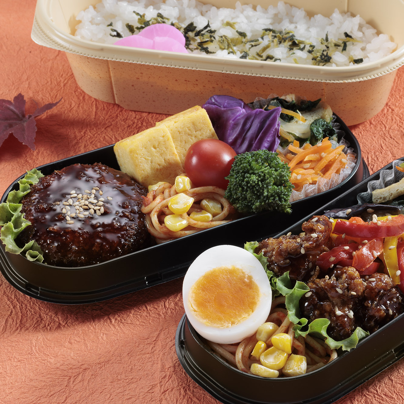 彩り鮮やかなおかずとご飯が2層になった持ち運びにスマートなお弁当が登場。メインのおかずは、若鶏甘酢あんとキャベツメンチカツの2種類。その日の気分に合わせてお選びいただけます。